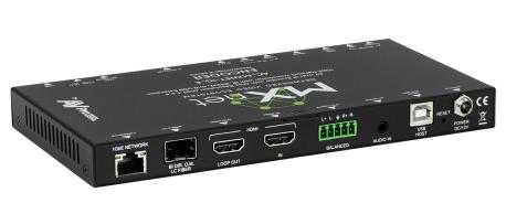 Trasmettitore 1G AV over IP. Risoluzione massima 4K 30 Hz 4:4:4. Formati audio supportati: PCM 2.0 canali, LPCM 5.1 e 7.1, Dolby Digital 5.1, DTS 5.1, Dolby Digital Plus, DTS-HD High Resolution e DTS-ES. Controllabile tramite Ethernet, IR, Hi-speed USB o RS-232. Ingressi e uscite principali: 2x Rj45 una per la trasmissione MXnet e una per la trasmissione Dante, 1x porta SFP, 1x HDMI input, 1x HDMI output, 1x RS-232. Distanza massima tramite cavo Ethernet di 100 m e fino a 10 km tramite la fibra in Single-mode(in Multi-mode 550 m). Consumo energetico totale 6.5W. Possibilità di montaggio a rack. Dimensioni: 19.9x10.3x1.35 cm. Peso: 0.57 kg Colore: nero. Garanzia di 10 anni.
