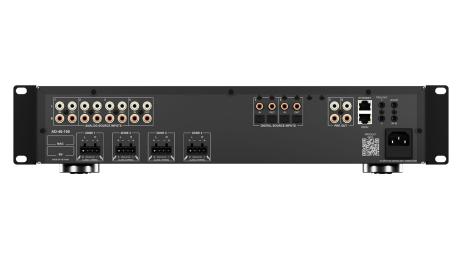 Matrice Amplificata con DSP per distribuzione audio 4x6: gestisce 4 sorgenti analogiche (RCA stereo) e 2 ingressi digitali (2 coassiali + 2 ottici, in mirroring su analog 1–2). Distribuisce l’audio su 6 zone, con 4 zone stereo amplificate e 2 zone pre-out per ampli esterni o subwoofer. Potenza fino a 100 W per canale a 4 O (50 W/canale a 8 O); uscite configurabili e possibilità di bridging fino a 200 W/canale su carichi idonei. DSP integrato per ottimizzazione zona-per-zona (equalizzazione, filtri, ritardi e gestione livelli) e controllo tramite RS-232, IP o IR. Dimensioni (LxPxH): 43,7x8,9x41,65 cm; Peso: 10,38 kg