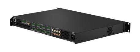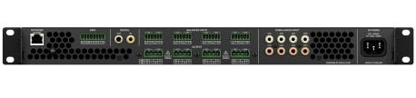 Amplificatore matrix DSP in classe D per sistemi multi-zona con combinazione di uscite a bassa impedenza (4–16 O) e linee 70V/100V. Ingressi: 8 canali analogici (bilanciati o sbilanciati) e 1 ingresso digitale S/PDIF stereo; uscite: 8 canali amplificati (125 W/canale @ 4/8 O) oppure 4 canali 70V/100V (250 W/canale), con configurazioni miste per adattarsi all’impianto. DSP integrato per ottimizzazione zona-per-zona (matrix, EQ, filtri, delay) con configurazione via web GUI; controllo tramite IP o GPIO. Installazione a rack 1U o free-standing; predisposto per espansione tramite daisy-chain. Dimensioni (LxPxH): 44x32x4,45 cm; Peso: 3,8 kg