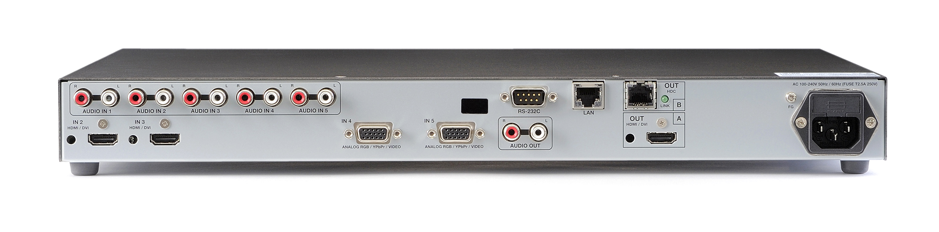 Singolo scaler multi ingresso analogico digitale + audio con 1 uscita parall. HDMI e HDBaseT, max risoluz. QWXGA (RB), commutaz. seamless, auto switch, memoria logo, contr. aspect ratio, test pattern generator, contr. EDID video e audio su ogni ingresso, comp. HDCP 1.4, Anti-snow, Connection reset, contr. totale audio in/out + lip sync + analog audio out. Memorie Crosspoint, Preset, last use. Conn.: 3 IN e 1 OUT HDMI con morsetto di ritenzione, 2 VGA (selez. RGBHV, YPbPr, Y/C, comp.), 5 IN + 1 OUT audio st. RCA, 1 OUT HDBaseT, 1 RS-232, 1 LAN. Switch LAN integrato verso HDBaseT. Contr. Apparati terze parti con macro RS-232, LAN, CEC. Pannello frontale con tasti retro illuminati, display VFD, contr. Totale dei parametri da menù navigabile. Controllo: pann. Frontale, RS-232, LAN (SW e web). Dimensioni (WxHxD): 430x44x350 mm, 1U montaggio rack fornito. Peso: 4,2 kg. Alimentatore interno multitensione max 43 W.