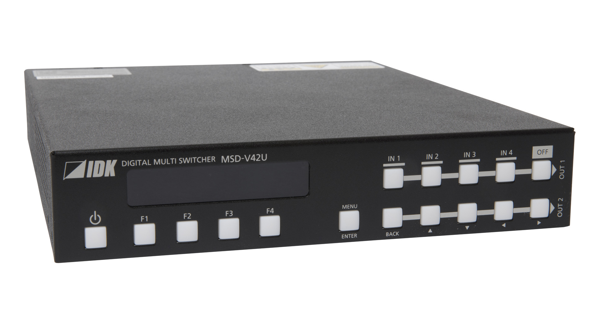 Doppio scaler indipendente multi ingresso 4 HDMI + 1 audio stereo, 2 uscite HDMI + 1 audio stereo, max risoluz. 4K @60 4:4:4 HDCP 2.2. Commutaz. seamless, PiP/PbyP, le 2 uscite possono essere anche usate per ottenere una visualizzazione a canvas unificato, con visualizzazione libera di 1 finestra o max 2 finestre PiP su 2 visualizzatori. Auto switch, audio breackaway, memoria logo, contr. aspect ratio, test pattern generator, contr. EDID audio/video, Anti-snow, Connection reset, contr. totale audio in/out + lip sync + analog audio out. Memorie: Crosspoint (9), Preset (9), Pattern (5), last use. Connessioni: 4 IN e 2 OUT HDMI (4K @60 4:4:4), 4 IN audio (HDMI) + 1 IN e 1 OUT audio stereo sbilanc. Controllo 1 RS-232, 1 LAN, 3 OUT chiusure contatti. Controllo apparati terze parti con macro (64) RS-232, LAN, CEC, contatti. Pann. frontale: tasti retro illuminati, display VFD, contr. totale da menù navigabile. Controllo: pann. frontale, RS-232, LAN (web). Dimensioni (WxHxD): 210x42x250 mm, 1/2 Ur. Peso: 1,8 kg. Alimentatore esterno multi tensione 12 V 2,6 A.