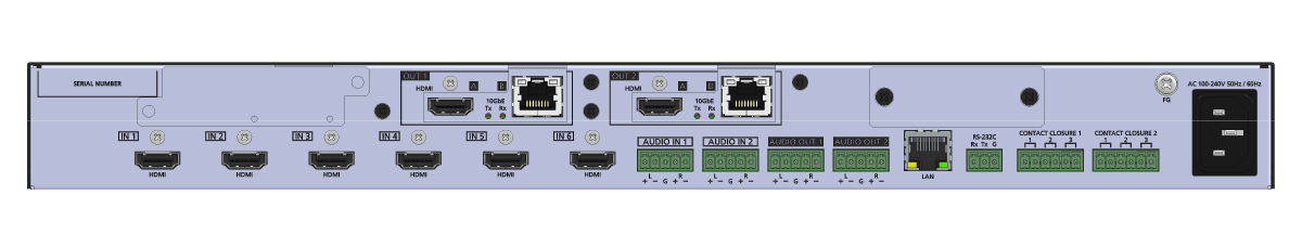 Doppio scaler multi ingresso 6 HDMI + 2 audio stereo, 2 uscite parallele 1 HDMI + 1 SDVoE su porta LAN 10Gb (RJ45 cavo CAT 6A) + 2 audio stereo, max risoluz. 4K @60 4:4:4 HDCP 2.2. Espansioni opzionali: 1 ingresso HDBaseT o SDVoE (CAT o Fibra), scheda audio Dante I/O. Commutazione seamless, PiP/PbyP, le 2 uscite possono essere anche usate per ottenere una visualizzazione a canvas unificato, con visualizzazione libera di 1 finestra o max 2 finestre PiP su 2 visualizzatori. Auto switch, audio breakaway, memoria logo, controllo aspect ratio, test pattern generator, controllo EDID audio/video, Antisnow, Connection Reset, gestione totale audio in/out + lip sync + analog audio out. Memorie: Crosspoint (9), Preset (9), Pattern (5), last use. Connessioni: 6 IN e 2 OUT HDMI + SDVoE LAN 10Gb (RJ45), 6 IN audio (HDMI) + 2 IN e 2 OUT audio stereo bilanc. 1 slot espansione ingresso video (IN6), 1 slot espansione scheda Dante. Controllo 1 RS-232, 1 LAN, 6 out chiusure contatti. Controllo apparati terze parti con macro (64) RS-232, LAN, CEC, contatti. Pann. frontale: tasti retro illuminati, display VFD, contr. totale da menù navigabile. Controllo: pann. frontale, RS-232, LAN (web). Dimensioni (WxHxD): 430x44x350 mm, 1U. Peso: 4,7 kg. Alimentatore integrato multi tensione 75 W.