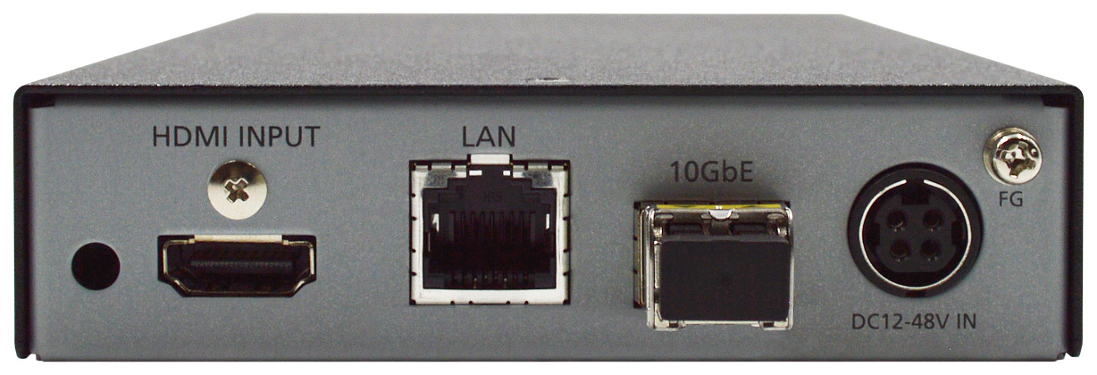 Trasmissione LAN/IP su fibra ottica (modulo SFP+ non fornito, su OM3 fino a 300 m, su OS1 fino a 10 km) con standard SDVoE. Utilizzo: punto punto (extender), sistemi matriciali attraverso switcher di rete LAN con porte F.O. a 10 GbE. Modalità di visualizzazione: single screen & scaling, multiview/PiP & scaling, videowall & scaling. 1x ingresso HDMI/DVI comp. HDCP 1.4/2.2 e HDR, campionamento 4:4:4, dot clock 25-600 MHz, TDMS clock 25-300 MHz, TDMS data rate 0,75-18 Gbps, profond. colore 8 10 12 bit (4K solo 8 bit). Trasmissione audio LPCM fino a 8 ch; 1x USB-B (x KVM HID); IR; RS-232; LAN 1 GbE, porta LAN 10 GbE su F.O. 2 LC. Funzioni: gestione EDID, DDC buffer, connection reset. Connettore HDMI con morsetto di ritenzione cavo. Indicatori LED per: alimentazione, segnale, TX, RX. Alimentatore esterno multitensione da 12 V DC 3 A, consumo 8 W. Dimensioni (WxHxD): 106x28x200 mm.