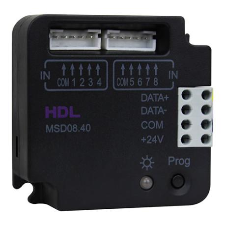 L’HDL MSD08.40 è un modulo di ingresso a 8 zone progettato per sistemi di automazione Buspro, ideale per integrare pulsanti, sensori e comandi multifunzione in impianti residenziali e commerciali. Il dispositivo accetta numerosi tipi di comandi come interruttori meccanici, single on/off, combinazioni, multifunzione e parallel switch, offrendo grande flessibilità per la gestione di scenari, sequenze, controllo luci, canali broadcast, tende, moduli di sicurezza e sistemi avanzati di supervisione.