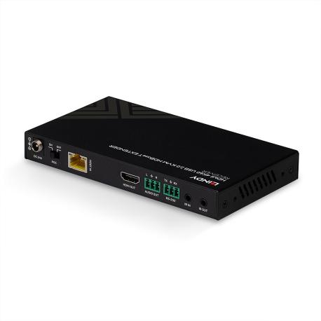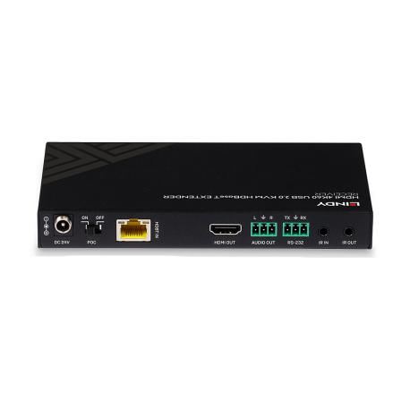 Ricevitore abbinabile al trasmettitore KVM 38387 permette la comunicazione bidirezionale USB 2.0 HID. Estende i segnali fino a 90 m in modalità standard a 4K @60 o 150 m in modalità LRM (FullHD), su cavo CAT6 FTP, supporta HDR. L'apparato integra le porte Tx e Rx per i segnali IR e RS-232. Accetta o fornisce l'alimentazione tramite PoH. Connettori: HDMI-A, audio Out L/R (morsetto), 2x USB-A, IR In/Out (minijack), RS-232 (morsetto), HDBaseT (RJ45). Dimensioni dispositivo (LxAxP): 157x20x88 mm. Alimentatore singolo 24 V DC 1 A.