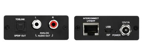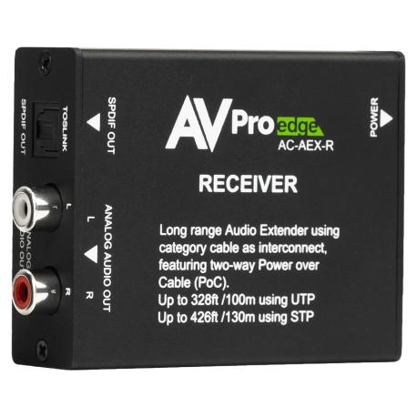 Extender audio (solo ricevitore) per il trasferimento di segnali stereo con compressi a medio-lunga distanza. Formati audio supportati: LPCM 2.0 e Dolby digital, DTS Digital ES. Tramite Dual-Play è possibile riprodurre simultaneamente il segnale audio sia alle uscite analogiche che digitali. Lunghezza massima del cavo se schermato 130 m, 100 m se non schermato. Ingressi e uscite analogiche o digitali (stereo, ottico, RJ45). Impedenza di uscita 600Ohm. Potenza richiesta di massimo 3W. Dimensioni: 2.2x5.8x8.2cm. Peso di 0.1 kg.