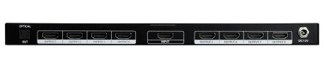 Distributore video di segnale HDMI 1x8 18Gbps. Permette di amplificare e trasmettere il segnale HDMI per lunghe distanze (soprattutto se collegato a catena). Possiede un'entrata HDMI, 8 uscite HDMI e un'uscita audio (digitale). Risoluzione massima fino a 4K 60 Hz 4:4:4. Risoluzione massima VESA fino a DCI 4K (4096x2160). Risoluzione HDR10, HDR10+, Dolby vision, HLG. Formati audio supportati: PCM 2.0 canali, LPCM 5.1 e 7.1, Dolby Digital, DTS 5.1, Dolby Digital Plus, Dolby TrueHD, DTS-HD Master Audio, DTS-X e Dolby Atmos. Larghezza di banda pari a 18 Gbps. Certificato HDCP (HDCP 2.2 e precedenti). Consumo energetico totale di 12W. Dimensioni: 30x11.5x2.1 cm. Peso: 0.90 kg Colore: nero