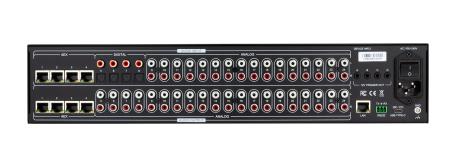 Matrice audio a 24ch input e 24ch output. Risposta in frequenza tra 20Hz a 20kHz. Frequenze supportate: 32, 44.1, 48, 88.2, 96, 176 e 192kHz. Input audio: 4x AEX, 16x RCA, 4x Digital Toslink e 4x Digital Coaxial. Output audio: 4x AEX e 20x RCA. Interfaccia di controllo del dispositivo RS-232, IP/LAN. Dimensioni: 8.8x44x23.5cm. Peso: 3.95 kg.