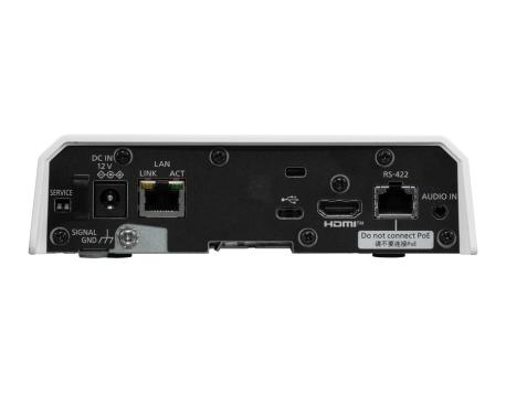 Installabile anche a soffitto, 4K MOS da 1/2,5" sensibilità min 3 lux, stabilizzatore d'immagine. Ottica zoom 24x, i.Zoom UHD 28x (FHD 36x), digital extender zoom 1.4x e 2x. Messa a fuoco min 10 cm (wide) 1.2 m (tele), messa a fuoco Auto o Manual. Angolo visione orizzont. 74.1° (wide) 3.3° (tele). Pan/Tilt: orizzontale ±175° (velocità max 90°-180°/s), verticale 30°+90° (max velocità 90°-180°/s). Risoluzioni: 3840x2160 (max 29,97p/25p), 1920x1080 (max 59,94p/50), 1280x720 (max 59,94p/50p). Guadagno manuale o automatico da 0 a +42 dB. Velocità shutter da 1/24 a 1/10.000 s. Uscita video: HDMI, USB-C. Ingresso audio Mic e Linea. Controllo tramite: protocollo RS-422 (RJ45), LAN IP (RJ45), web browser, USB-C. Numero di preset memorizzabili 100. Temperatura di lavoro da 0° a 40° C. Software opzionale per l'auto tracking AW-SF100/AW-SF200. Alimentazione 12 V DC, PoE+ (42-57V). Peso: 1.8 kg. Dimensioni (WxHxD): 160x192x166 mm. Colore: bianco.