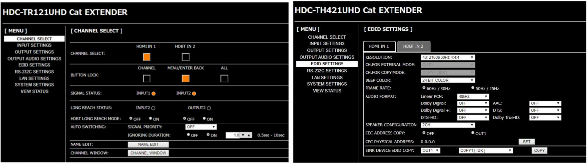 I dispositivi sono dotati di web server di gestione e configurazione, supportano il servizio LAN e RS-232 via HDBaseT e tramite porte locali. Ogni apparato è dotato di uno switch RS232 ed un hub LAN per interconnettere tra loro le porte HDBaseT e le rispettive porte fisiche oltre che la CPU. In questo modo è possibile configurare la CPU degli apparati, anche quando sono interconnessi tra loro, ma anche apparati terzi connessi alle loro porte HDBaseT o LAN o RS232.