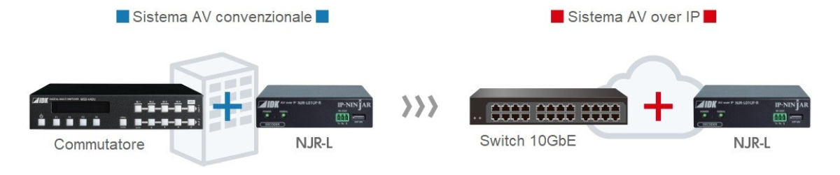 Se il sistema non richiede lo scaling dei segnali video, è possibile creare un sistema AV over IP utilizzando i modelli NJR-L01U. Un nuovo modello con trasmissione in fibra ottica è stato aggiunto alla gamma, oltre a quello in CAT6A, rendendolo compatibile con un'ampia gamma di sistemi.