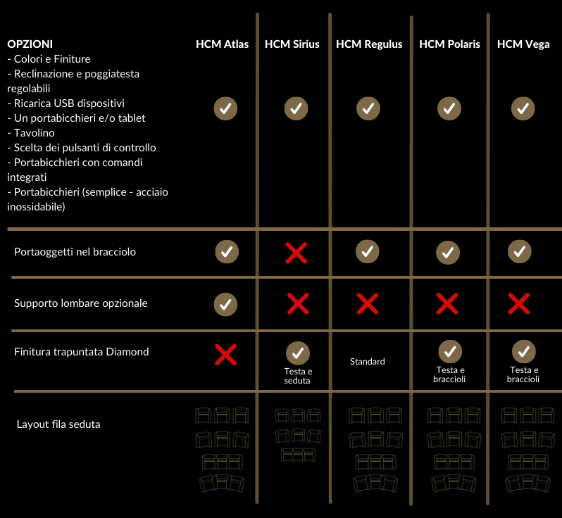 Oggetti che conferiscono alla propria sala cinema o living room incomparabile eleganza e qualità. Il luogo per l'intrattenimento della tua famiglia si trasforma e si compone di sedute stellari: Atlas, Sirius, Regulus, Polaris e Vega.