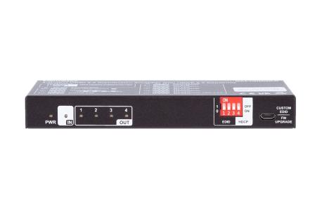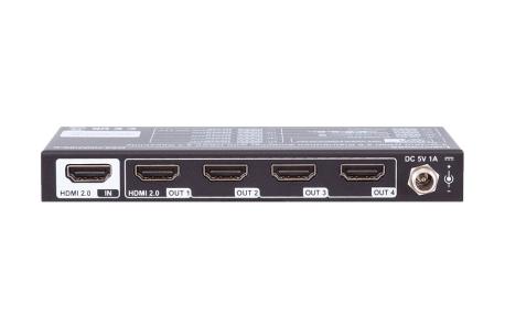 HDMI Splitter 1x4 con EDID Management (Emulation, Memory con 5 preset di fabbrica e 1 programmabile), e Pixel Accurate Reclocking. HDCP 2.3, risoluzione fino a 4096x2048 @60 Hz (4:4:4)/fino a 4096x2048 @60 Hz (4:2:2) a 12 bits/color. 3D support, Audio supportati tutti i formati HDMI 2.0 inclusi multi-channel PCM, Dolby True-HD e DTS-HD master audio. 1 IN/4 OUT HDMI, CONTROL mini USB-B. Dimensioni (WxDxH): 142x70.4x17.6 mm. Peso: 260 grammi.