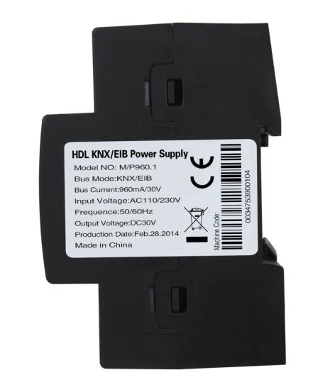 Il modulo di alimentazione da 960 mA, montaggio su guida DIN, entrambi 110/250 V CA, 50-60 Hz, può emettere una corrente massima di 960 mA al BUS EIB, protezione da sovraccarico e cortocircuito, con pulsante di ripristino.