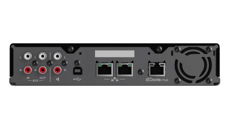 Unità DSP con interfaccia Dante. Input: x2 ingressi microfonici XLR bilanciati, x16 Dante, 2 RCA linea sbilanciati, USB2.0. Output: x2 RCA linea sbilanciati, x16 Dante, x2 USB 2.0 @48 kHz. LAN: Ethernet 1 Dante Audio/Dante Control, Remote Control, Web UI, PoE+; Ethernet 2/3 Corporate Network, Remote Control, SIP, Web UI. Funzionalità SIP: Call Handling, Call Bridging. Alimentazione PoE+ (IEEE 802.3at, LLDP), DC 48 V. Dimensioni (WxDxH): 215x260×44 mm. Peso: 1,6 kg.