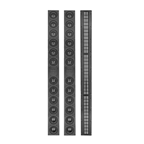 Set di diffusori da incasso a parete con woofer SAGE ad alte prestazioni. Composto da 2 diffusori per le Medie/basse frequenze con 12 mid/bass woofer da 6" ciascuno e 1 per le alte frequenze con 3 driver planari magnetici da 24" (61 cm) di lunghezza ciascuno. Impedenza nominale diffusore mid/bass di 6 ohm e diffusore high freq. planare di 3 ohm. 1000 W di potenza di picco. 96 dB di sensibilità e risposta in frequenza da 25Hz 20 kHz. Sono richiesti 5 ch di amplificazione, 2 per ciascun diffusore mid/bass e 1 per il diffusore ad alte frequenze. Dimensioni: 194.1x20.5x9.6 cm (AxLxP) ciascuno. Peso diffusore mid/bass 41 kg ciascuno. Peso diffusore planare 24 kg.