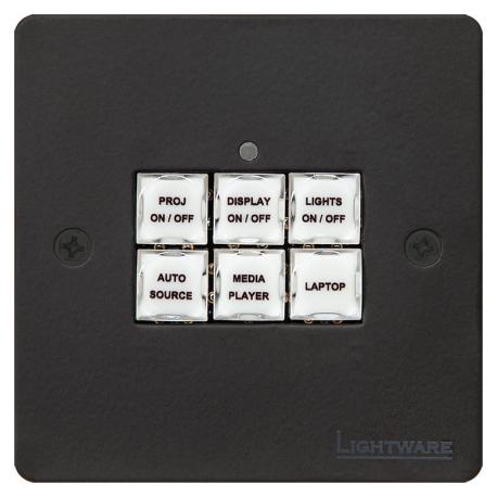 Pannello di controllo con 6 pulsanti programmabile con software Event Manager attraverso GPIO. Compatibile con wall mount e box esterne Europee. Connettori 1x 8-pole Phoenix for GPIO (7x GPIO, 1x GND), 6 pulsanti retrolluminati con etichetta customizzabile. Dimensioni (WxHxD): 80x 80x20,8 mm. Peso: 100 grammi. Colore: nero.