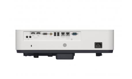 Rapporto proiezione 1,23-1.97:1, ottica manuale. Sistema illuminazione Laser, vita approssimativa senza interventi 20.000 ore, speaker 16 W. Contrasto infinito, shift ottico manuale 35% +55% vert., ±15%% orizz., correz. Trapezio e angolare ±30° vert., ±30° orizz. Segnali TV da 480i a 4K. Ingressi: 2 HDMI (HDCP), D-Sub15 (RGB/Component), 1 Composito, HDBaseT, audio IN/OUT (minijack), 2x USB. Connessioni controllo:RS-232 (DSub9), LAN+ HDBaseT (RJ45). Rumorosità 35 dB, consumo 434 W. Dimensioni (LxAxP): 422x129x338 mm. Peso: 6.8 kg, finitura bianca.
